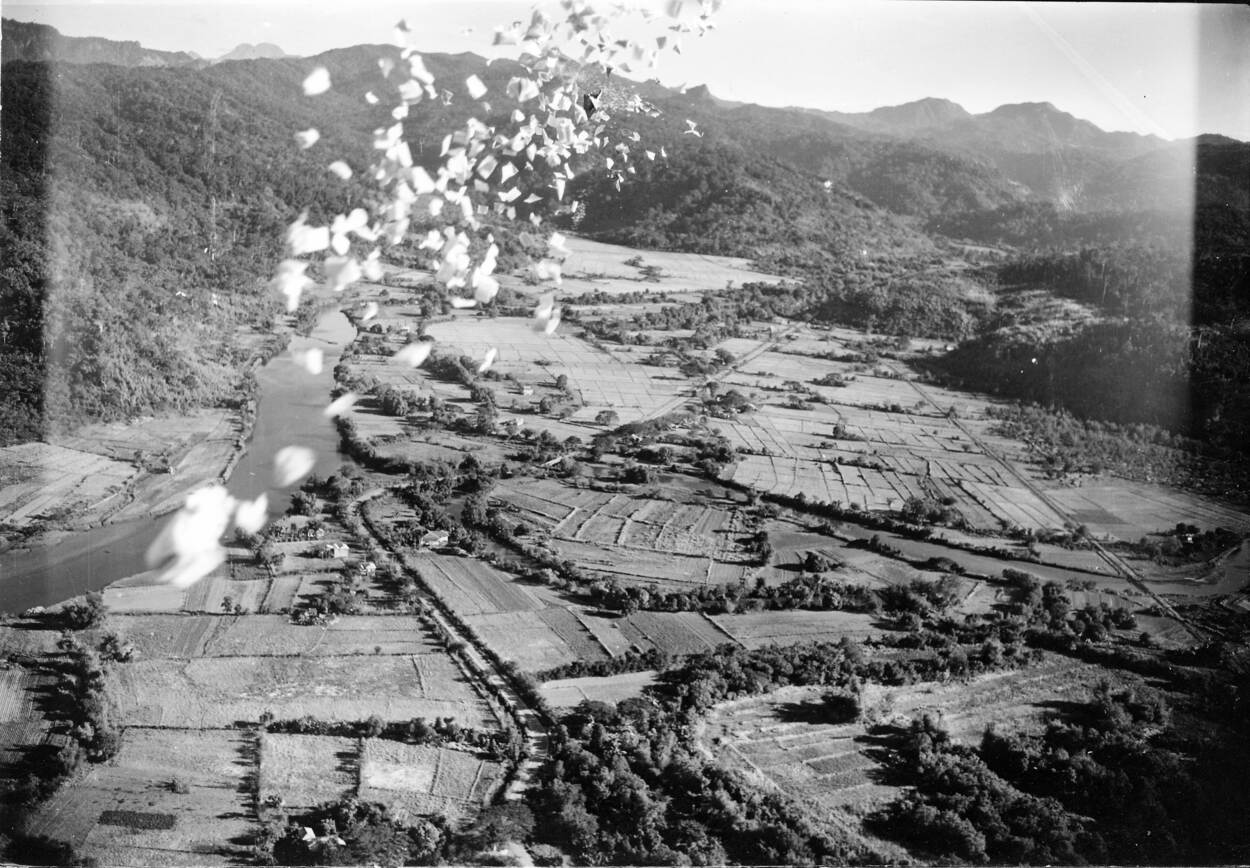 Het droppen van Geallieerde pamfletten over de rijstvelden van Azië, in dit geval in de buurt van Subic Bay op de Filippijnen, waarschijnlijk in 1944. Foto: State Library of South Australia.