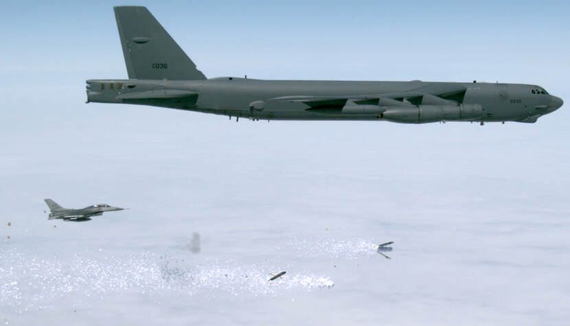 De US Navy test in 2005 het droppen van 60.000 pamfletten met een Payload Delivery Unit (PDU)-5 vanaf een F/A-18F Super Hornet. Met hetzelfde type ‘bom’ vliegen F-16’s van de US Air Force tijdens Operation Unified Protector, de luchtoorlog boven Libië in 2011. In 2017 gebruikt de USAF bij een test sinds lange tijd weer een zware bommenwerper. Een B-52 zorgt met meerder PDU-5’s voor een pamflettenregen (foto onder). Bommenwerpers die mensen redden in plaats van doden. De beste missie denkbaar. Foto onder: USAF