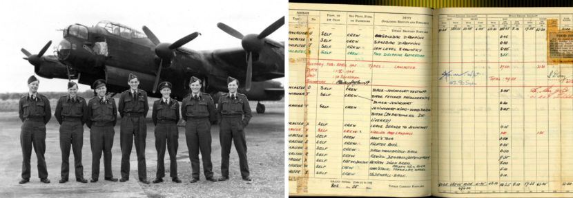 Heukensfeldt Jansen (m.) met zijn bemanning voor hun Lancaster ‘Cherokee’ vlak voor Operatie Manna. Rechts zijn logboek. Foto links: uit collectie NIMH.
