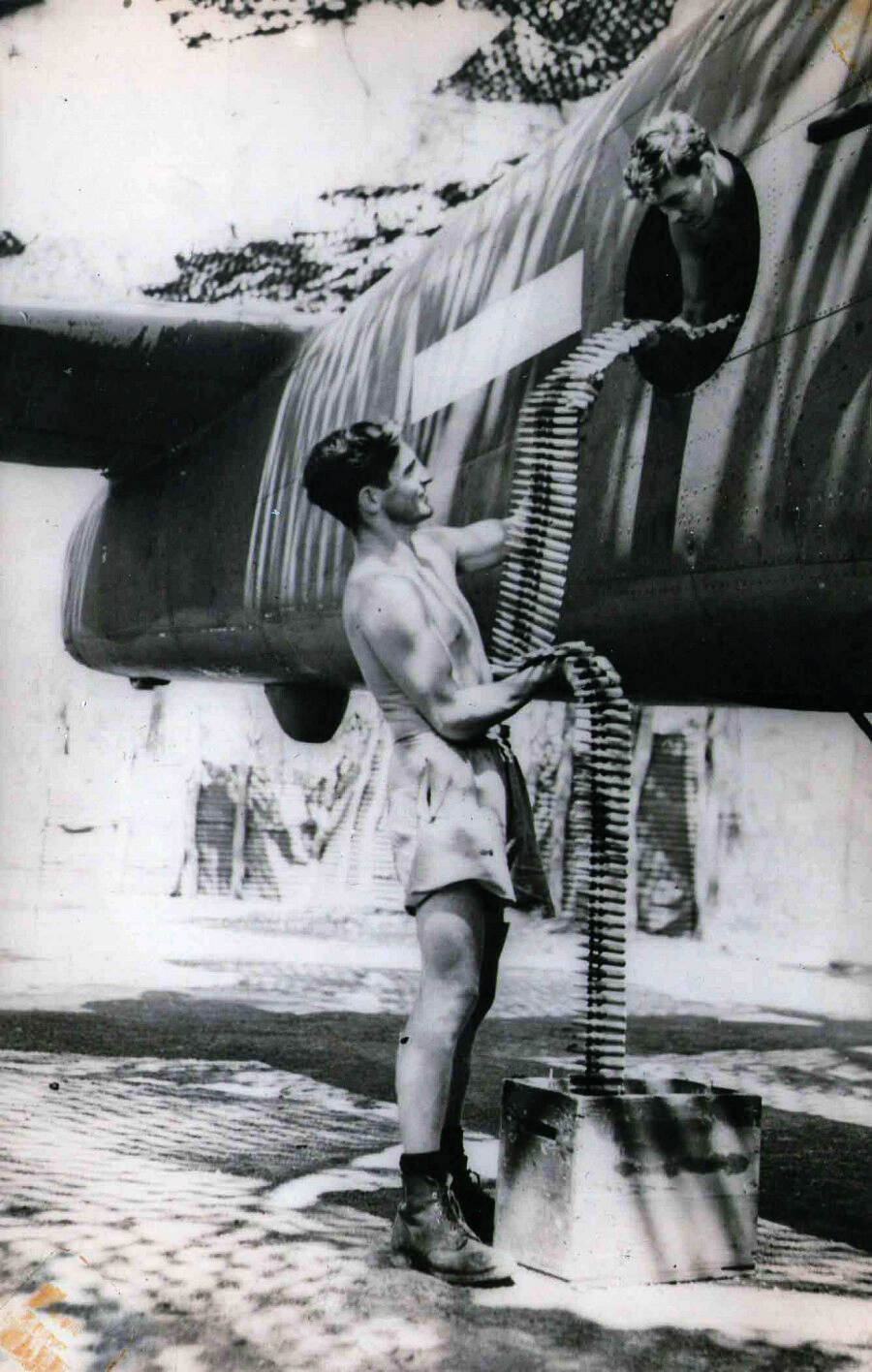 Ward bedient als telegrafist ook 1 van de ‘waist guns’ aan de zijkant van de B-25, waarvoor hier munitie wordt geladen.