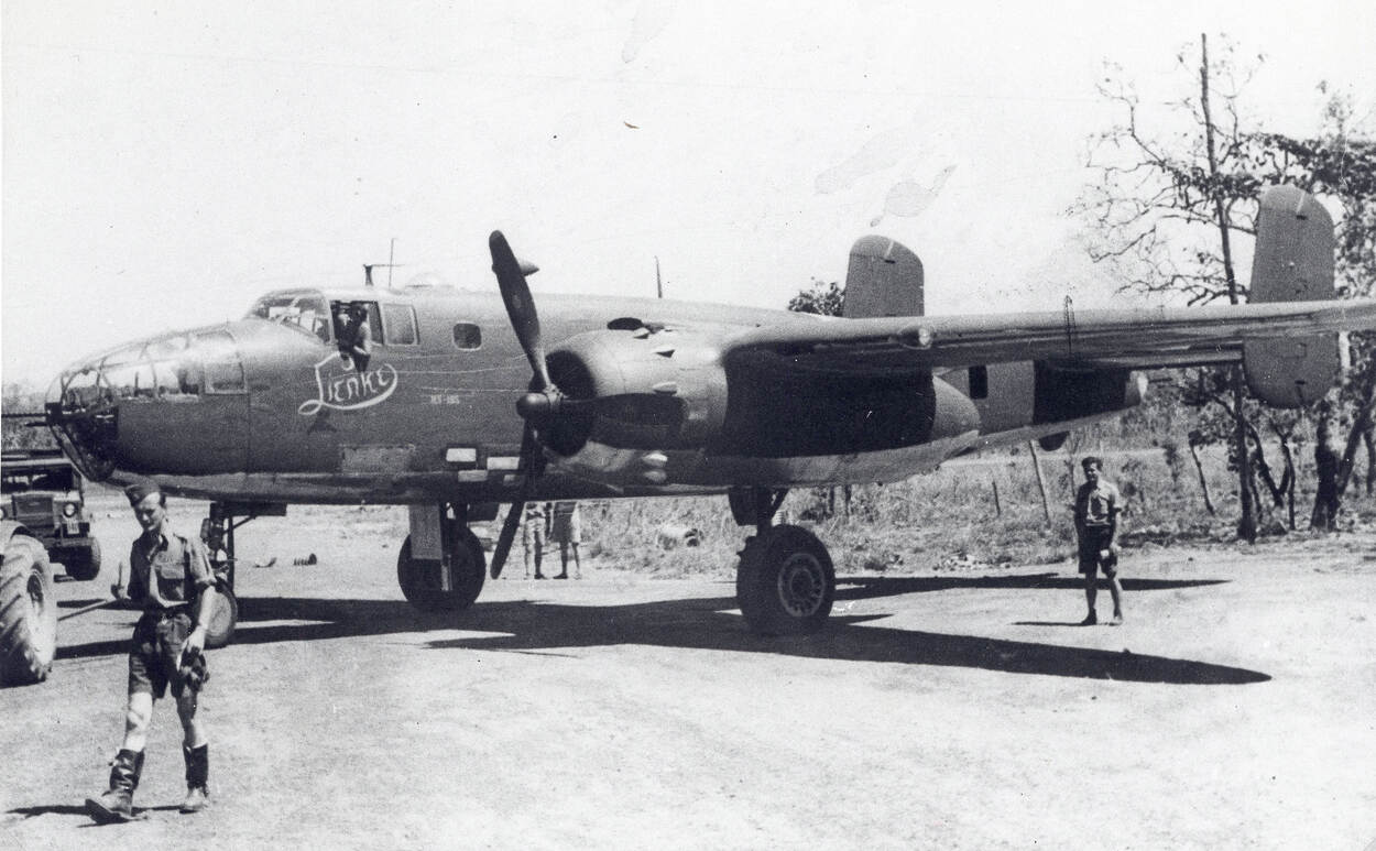 B-25 Mitchell ‘Lienke’, gevlogen door luitenant-vlieger Guus Hagers, op het vliegveld Potshot tijdens de voorbereidingen voor een speciale opdracht boven Java.