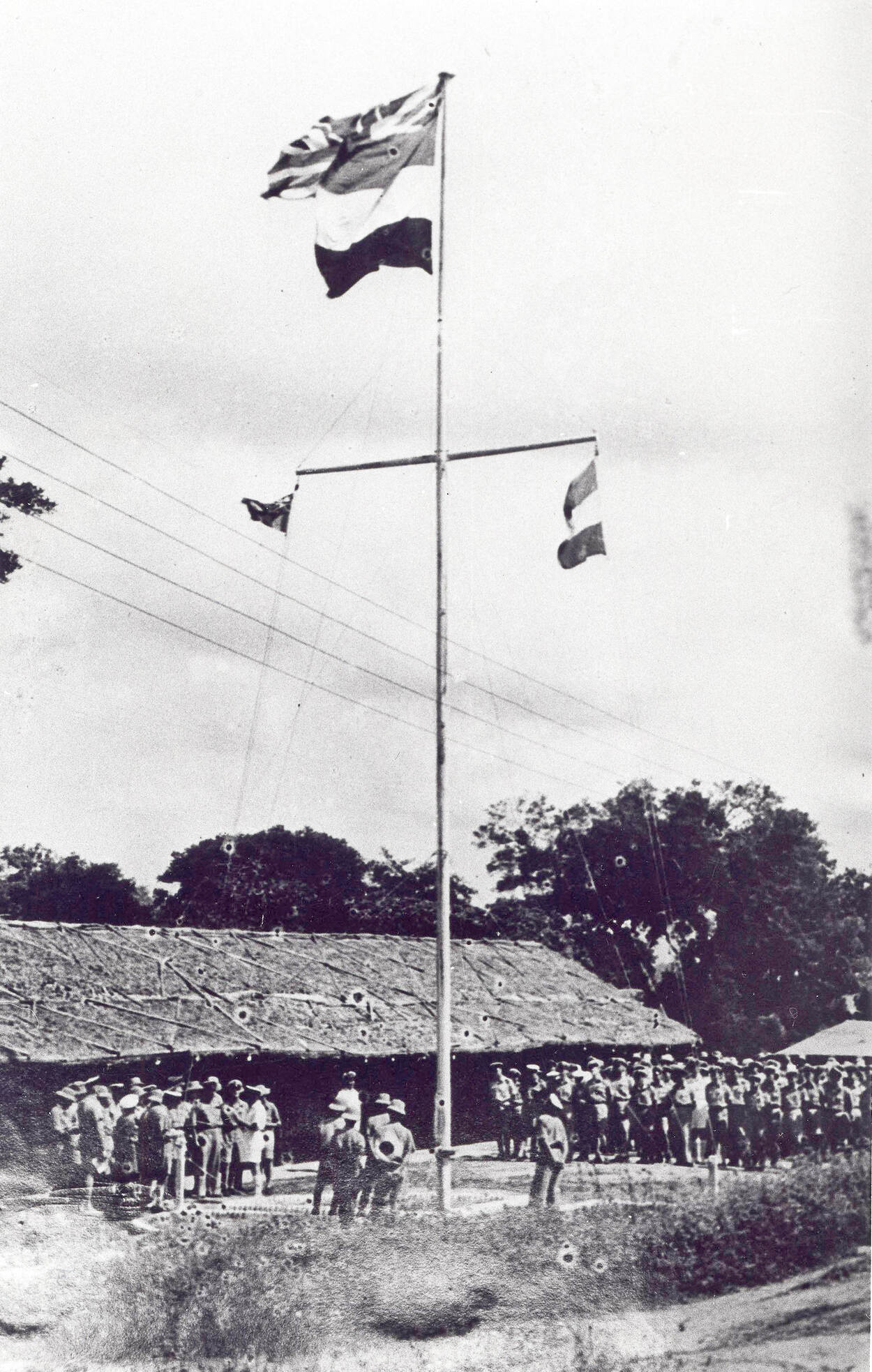 Het hoofdgebouw van RAF China Bay, waar zowel de Britse als de Nederlandse vlag wappert.