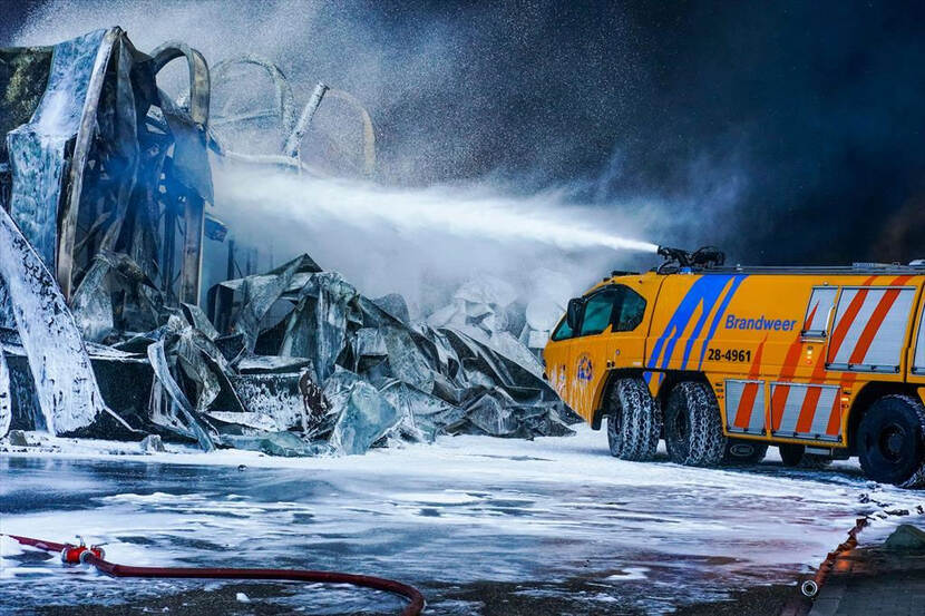 Wederom in Hapert, maar dan nog in Nederland, ging op 29 mei een transportbedrijf in vlammen op. De Veiligheidsregio vroeg wederom Eindhoven om assistentie, waarop zelfs 3 crashtenders uitrukten (foto). De zeer grote brand verlangde inzet van 12 bluswagens, 4 waterwagens en evenzoveel hoogwerkers. Daarvan vloog er zelfs 1 in brand door plotseling oplaaiend vuur. De Officier van Dienst van de Veiligheidsregio was zeer te spreken over de inzet van de basisbrandweer: “Jullie hebben echt het verschil kunnen maken. Zonder jullie slagkracht was het andere gebouw zeker niet behouden gebleven. Het is fijn om te ervaren hoe jullie ons kunnen en willen helpen.”