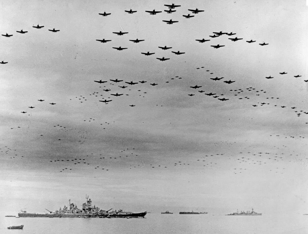 Op 2 september wordt de overgave van Japan ondertekend op het Amerikaanse slagschip USS Missouri in de baai van Tokyo. Direct daarna klinkt het indrukwekkende slotakkoord van de militaire luchtvaart. Een steeds zwaarder wordende trilling is voelbaar en geronk zwelt tot bijna oorverdovend aan. Aan de horizon is te zien waarom. Om de overmacht van de geallieerde kracht bij te zetten, volgt er een fly by van 450 US Navy vliegtuigen (foto onder) en liefst 525 US Army Air Force B-29 bommenwerpers.