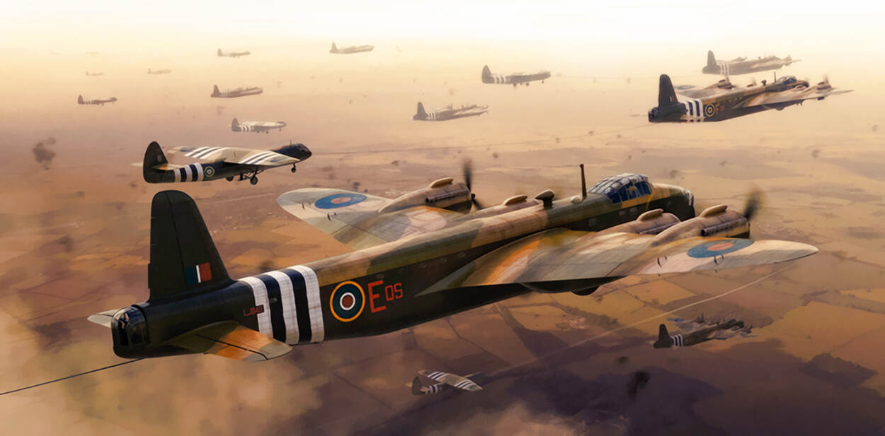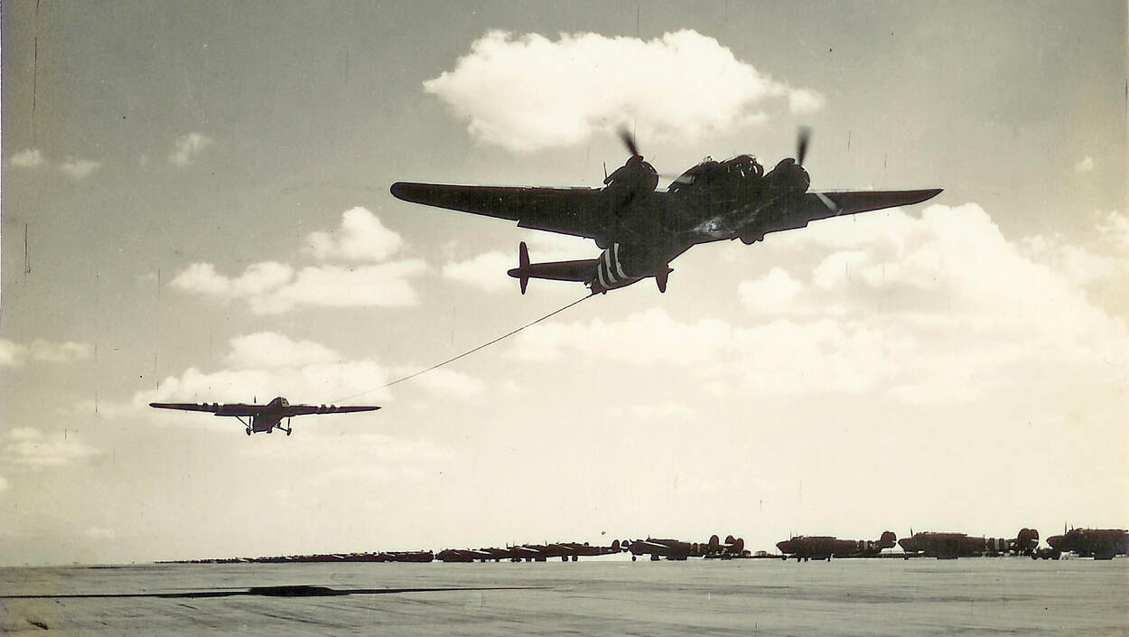 Zo vliegt de 21-jarige Bill Eames op 6 juni 1944 vanuit Engeland naar Normandië, in een Albemarle transportvliegtuig dat een Horsa glider sleept.