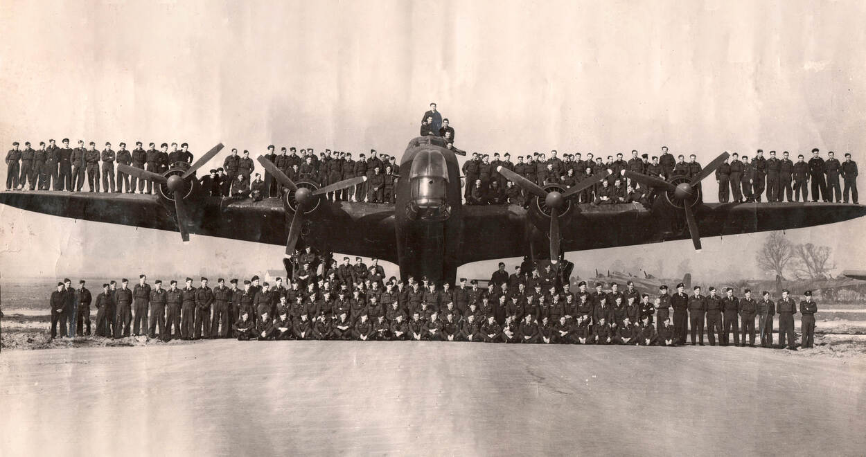 Bemanningen op RAF Harwell poseren voor en op een Short Stirling. De foto is gemaakt toen Eames in het ziekenhuis lag. Staand links op de grond de 3 overgebleven bemanningsleden van Eames’ squadron.