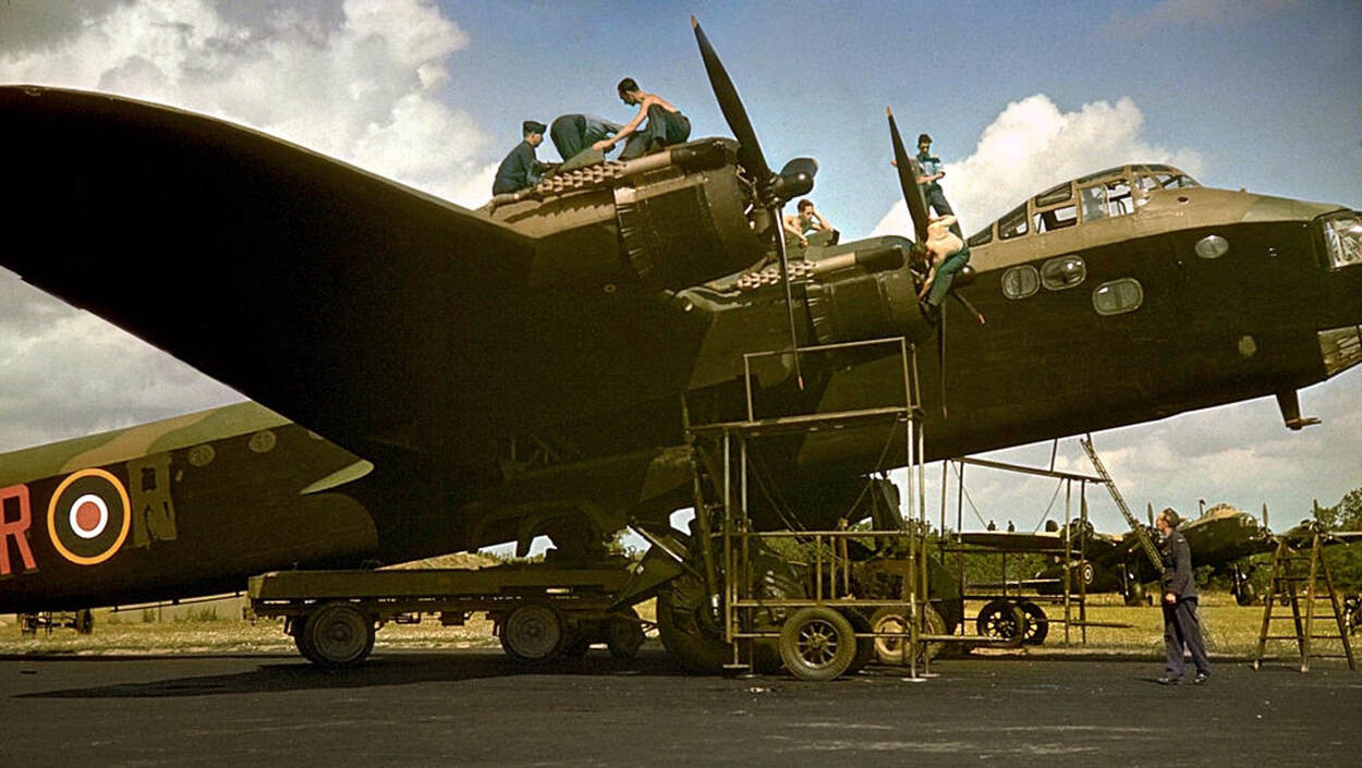 Een van de schaarse goede afbeeldingen in kleur van een Stirling. Van alle types Britse bommenwerpers in WOII is alleen van de Stirling geen exemplaar bewaard gebleven, alleen 2 rompdelen zijn er nog: 1 in Frankrijk en 1 in het museum bij vliegbasis Deelen.