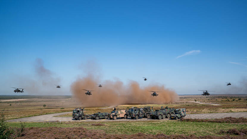 Deze oefening was er een in het kader van hoofdtaak 1: het beschermen van Nederlands grondgebied. “Het scenario was staal op staal, dus tanks die de bedreiging vormen en wij schakelden ze uit”, legt Diego uit. “Command and Control is met 8 helikopters heel anders dan met kleinere aantallen. Je volgt en managet alle gevechtshandelingen vanuit de cockpit en er gebeurt dan zóveel. We kónden dit nu een keer doen en wílden het ook. Dit was waarschijnlijk ook de laatste keer mogelijk met de AH-64D. De komende jaren zijn er minder heli’s beschikbaar omdat we afbouwen voor de conversie naar de AH-64E.” Foto: KLu