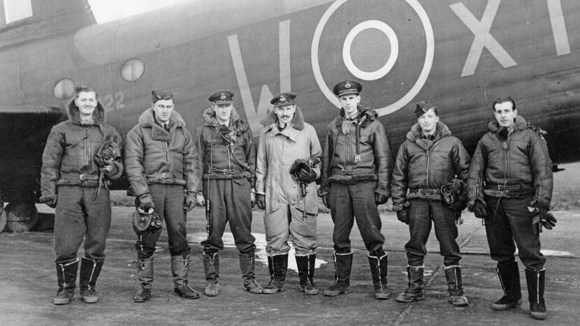 De bemanning van de BK716, hier in februari 1943 poserend voor een andere Short Stirling, met van links naar rechts: sergeant Ronald Kennedy (22; boordwerktuigkundige en boordschutter), sergeant Leonard Shrubsall (30; boordwerktuigkundige en boordschutter), flying officer John Michael Campbell (30; radio operator en boordschutter), flying officer John Harris (29; gezagvoerder), flying officer Harry Farrington (24; navigator, RCAF*), flight sergeant John McCaw (20; staartschutter, RCAF*) en sergeant Charles Bell (29; bommenrichter).
