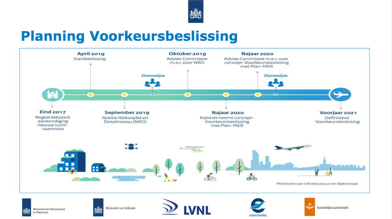 Afgelopen 18 december keurde het kabinet de Ontwerp Voorkeursbeslissing Luchtruimherziening goed. Daarin zijn 12 besluiten genomen inclusief de milieuonderbouwing door het Nederlands Lucht- en Ruimtevaartcentrum en advies- en ingenieursbureau Royal HaskoningDHV. Bovendien geeft de Milieu-effectreportage aan dat het een positief besluit is. Het ontwerp ligt nu ter inspraak en om het toe te lichten, gaan Spanjer en Vrugt de provincies rond. Daarna volgt het definitieve voorkeursbesluit en wordt met Duitsland het grensoverschrijdend oefengebied in kaart gebracht. Vanaf 2023/2024 moet dan de spreekwoordelijke schep in de grond.