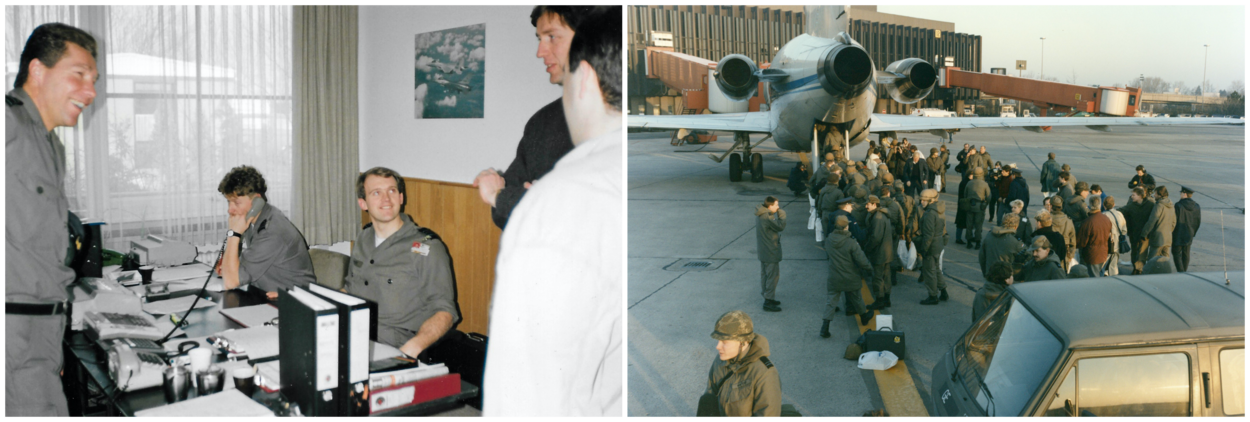 Voorbereiding op de thuisbasis van 5GGW (links, met Oppers zittend rechts) en het vertrek van het personeel met een Belgische Luchtmacht Boeing 727 vanaf de Duitse vliegbasis Wunstorf. Foto links: uit collectie Oppers