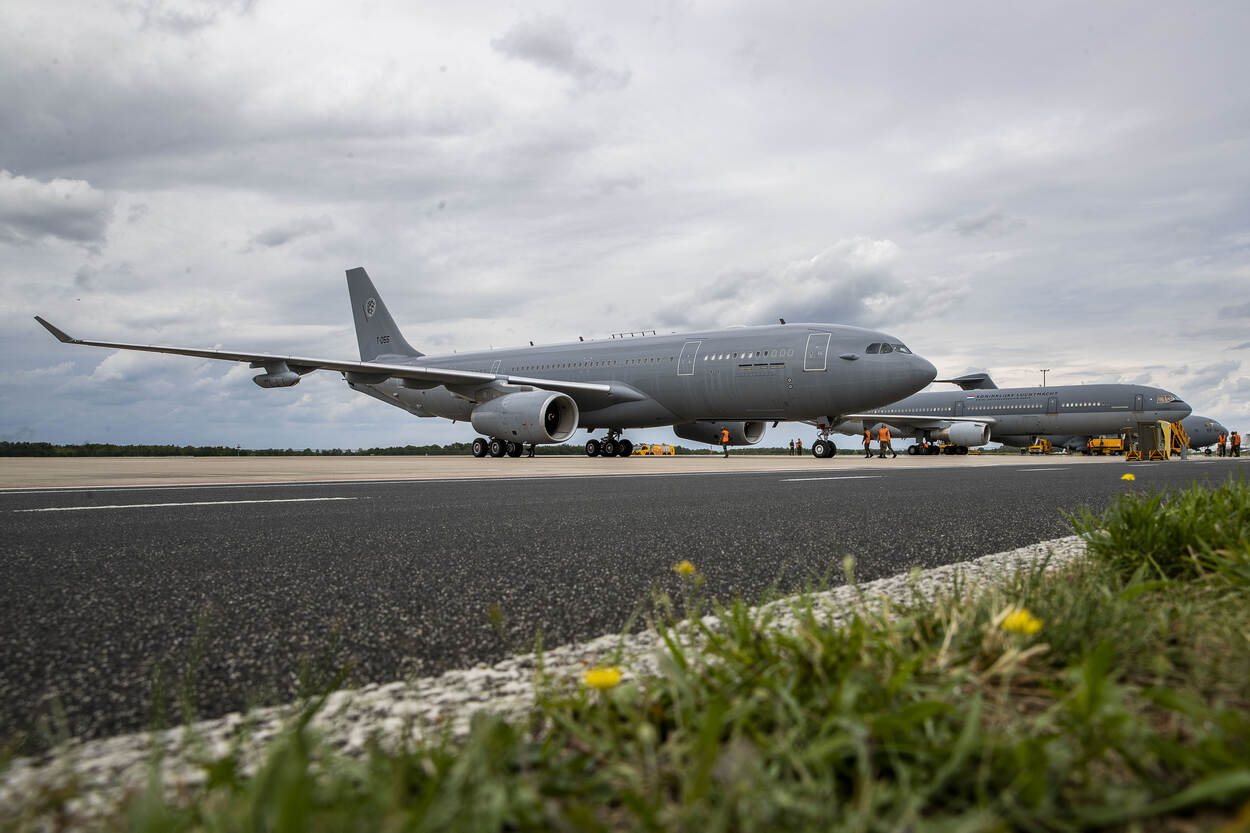 De drie internationale organisaties Multinational MRTT Unit (MMU), European Air Transport Command (EATC) en Movement Coordination Center Europe (MCCE) zijn medegebruikers van Vliegbasis Eindhoven én strategische partners van het AMC. Op de voorgrond van de foto staat een A330 MRTT, het nieuwste vliegtuigtype dat zijn thuisbasis op Eindhoven heeft. Foto: sergeant Cinthia Nijssen