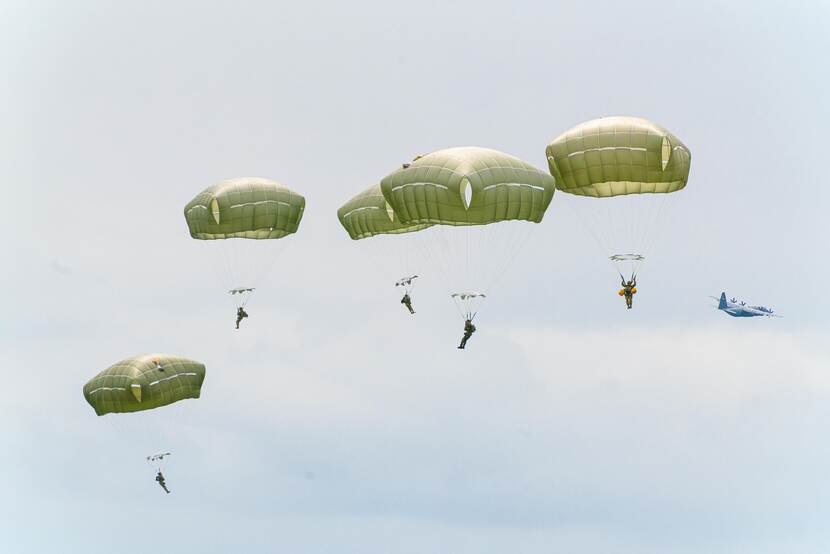 Over zo’n twee tot drie jaar verhuist de Defensieparaschool van Breda naar Vliegbasis Eindhoven. Zowel nationale als internationale eenheden worden er opgeleid. Commandant AMC: “Samen zijn we allemaal gerelateerd aan ‘air mobility’; een goede stap dus om het straks hier op het veld te hebben!” Foto: Louis Meulstee