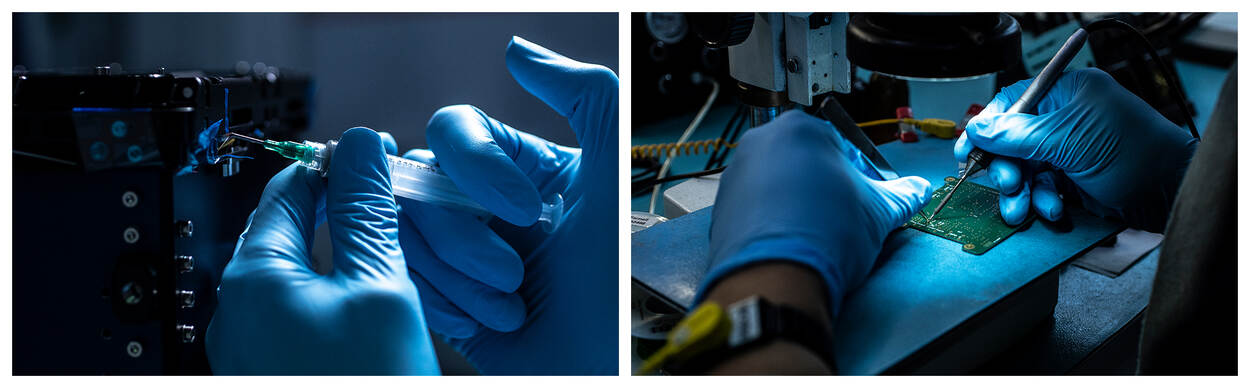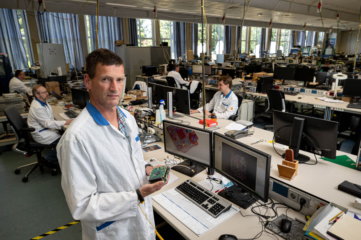 Een nanosatelliet ontwikkelen en bouwen is specialistenwerk. Alles is klein, delicaat en moet sterk genoeg zijn de lancering en de drie jaar durende ruimtereis te overleven. De minuscule chip positioneren op de printplaat was het meest complex. Foto's: sergeant-majoor Hille Hillinga