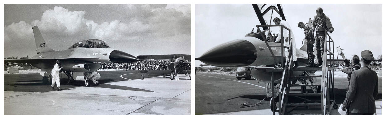 Na een introductierondje boven de Friese elf steden komt de formatie van twee Starfighters, een duo NF-5’en en de eerste Nederlandse F-16, op 7 juni 1979 boven vliegbasis Leeuwarden aan. Bij de tweede passage breekt de Fighting Falcon uit de formatie en klimt bijna verticaal de wolken in. Vlieger Wim Sneek laat daarna meteen zien waartoe de F-16 in staat is. “Het toestel kan ongelofelijk krap draaien.”