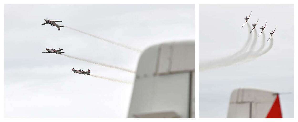 Terwijl ‘Heavy Cross’ van The Gossip door de luidsprekers schalt, voeren de vliegers hun manoeuvres uit met de PC-9.