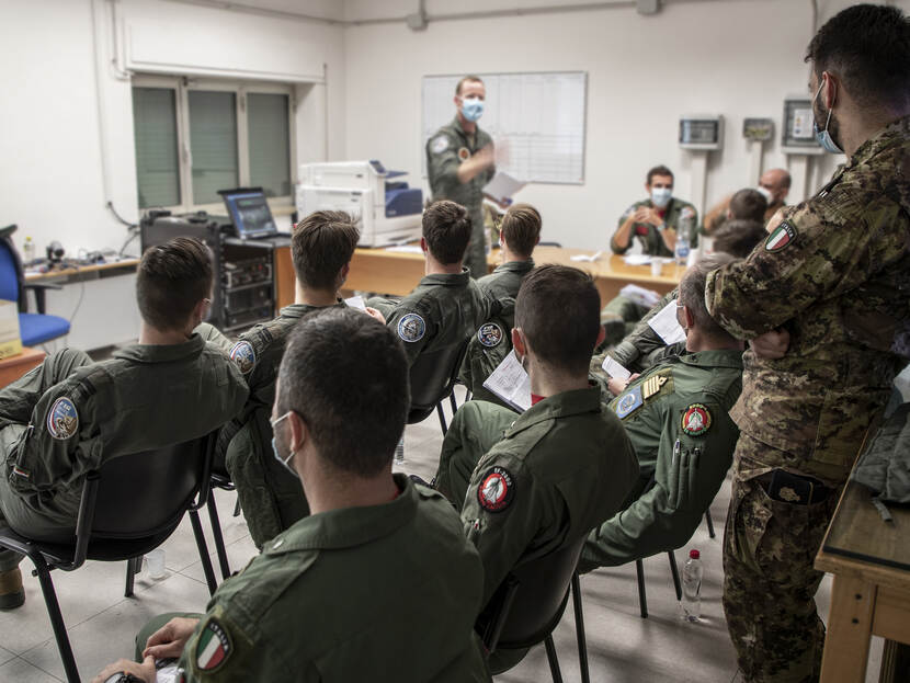 Tijdens het verblijf op Gioia passeren vele aspecten van het luchtoptreden de revue. Nadruk ligt op combined air operations en defensive counter air missies. Het handhaven van een no fly zone boven eigen grondgebied, air policing, luchtsteun aan grondtroepen en combat search and rescue niet uitgezonderd. Bij het zoeken naar een vermiste vlieger tuigen de Italianen een compleet scenario op, waarbij er wordt gezocht door zowel F-16’s als Eurofighters. “Al met al zijn we lang niet zo verschillend als dat je zou denken”, concludeert commandant 312 luitenant-kolonel-vlieger Patrick Vreeburg. “We vallen allemaal onder de paraplu van de NAVO en maken dus gebruik van dezelfde procedures en regelgeving.”