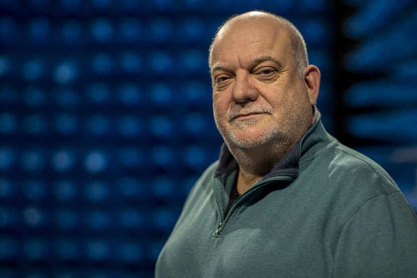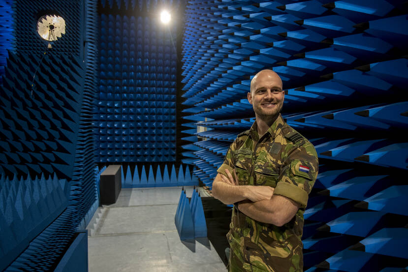 Majoor Bas van Odenhoven in de kooi van Faraday, de testruimte voor antennes.