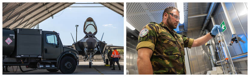 Voor de Nederlandse F-35’s komt de brandstof van een bedrijf een paar landen verderop. Foto rechts: sergeant Dennis voert een kwaliteitscontrole uit.