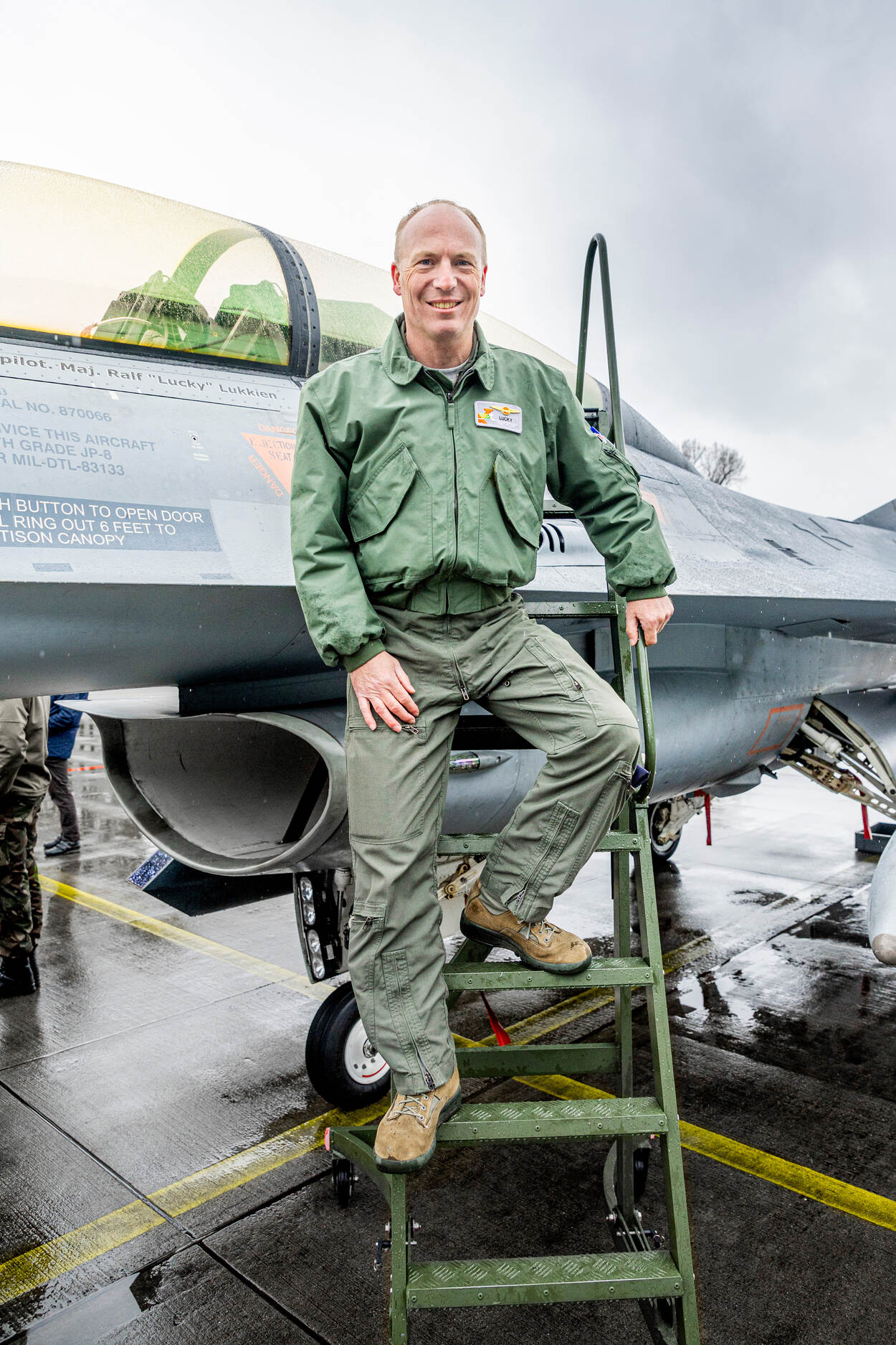 “Als technisch officier heb je meestal geen idee wat een vlieger in de lucht meemaakt, maar ik heb dat van dichtbij mogen zien. De snelheid, versnelling, krachten op je lijf, het vermogen van de motor; het is lastig te omschrijven hoe dat voelt, maar straaljagervliegen is niet voor niets een jongensdroom. Eigenlijk begint het al bij het aantrekken van de vliegveiligheidsuitrusting, zoals de G-broek, het harnas en in het vliegtuig je helm met zuurstofmasker. Daarmee neem ik helemaal ingesnoerd boven de motor plaats: een goed gevoel.