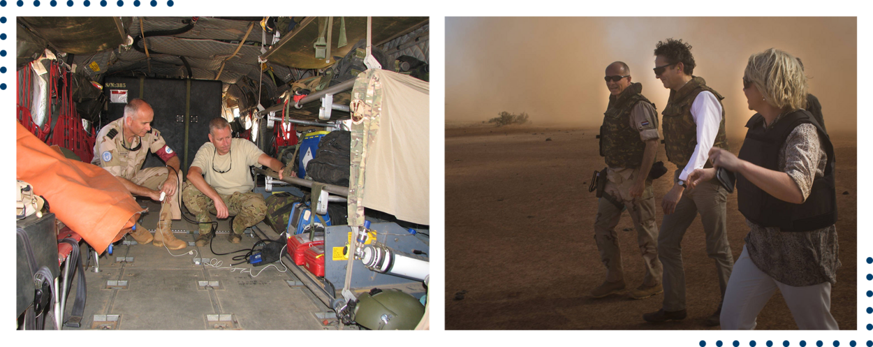 Als contingentscommandant in Mali. Van Ingen krijgt uitleg over de medevac (medische evacuatie) apparatuur in een Chinook. (Voormalig) ministers Koenders (Buitenlandse Zaken) en Hennis (Defensie) brachten in deze periode een werkbezoek. Foto’s: uit privécollectie