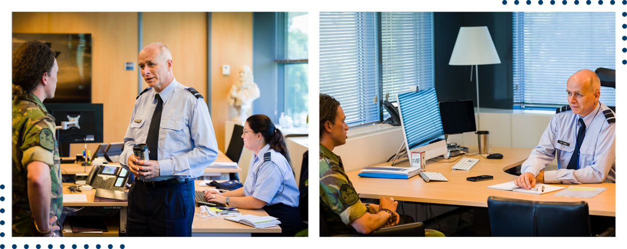 “Mijn rode draad op dit moment is met de staf beter aansluiten op de commands van de luchtmacht en de ontwikkelingen van de Defensiestaf en de Bestuursstaf in Den Haag. En die verbinding tussen hen goed leggen. Met de staf wil ik de commands ontzorgen bij alles wat er op de luchtmacht afkomt nu de Defensienota 2022 is verschenen. Die prio geef ik aan de staf en aan mijn rol. Maar hoe maak ik mogelijk dat de mensen op de staf dit ook kunnen? De manier waarop we de staf inrichten qua processen en structuur kan daarbij helpen. Ik denk ook dat het belangrijk is dat we rust brengen in ons werk op de staf. Daarmee bedoel ik dat we zoveel mogelijk verstoringen en de waan van de dag moeten voorkomen. Als we straks gaan reorganiseren blijft het werk in de tussentijd gewoon doorgaan. Alles heeft nu een extra impuls gekregen vanwege de Defensienota.