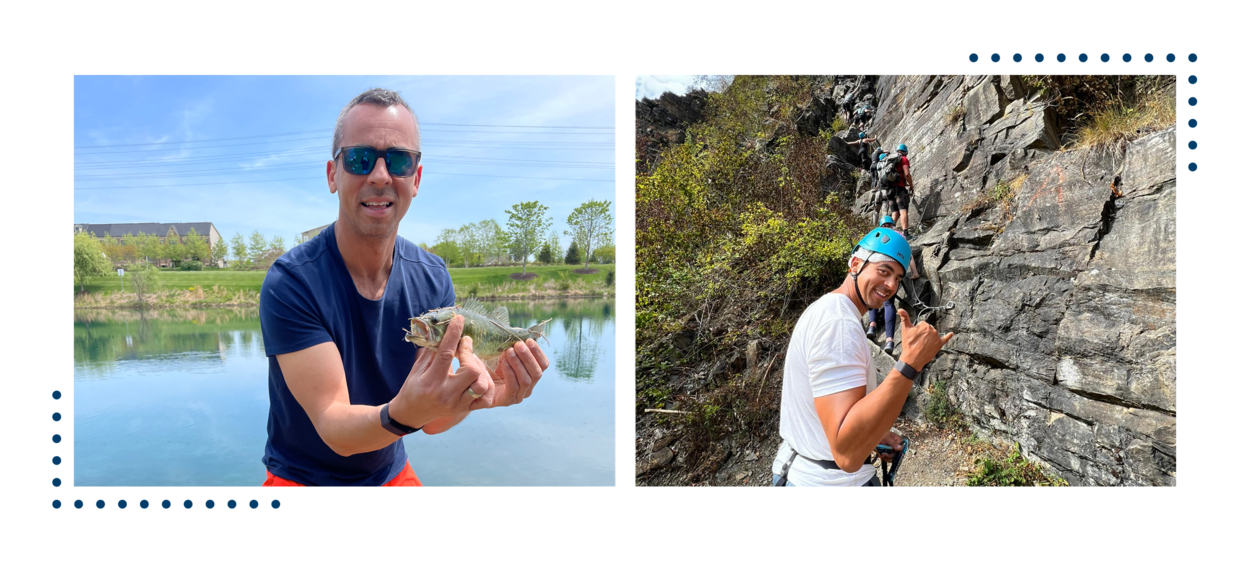 Buitenavonturen: op zijn favoriete visplek in Reston, Virginia een (kleine) large mouth bass aan de haak geslagen en klimmen in de Ardennen vlakbij Dinant.