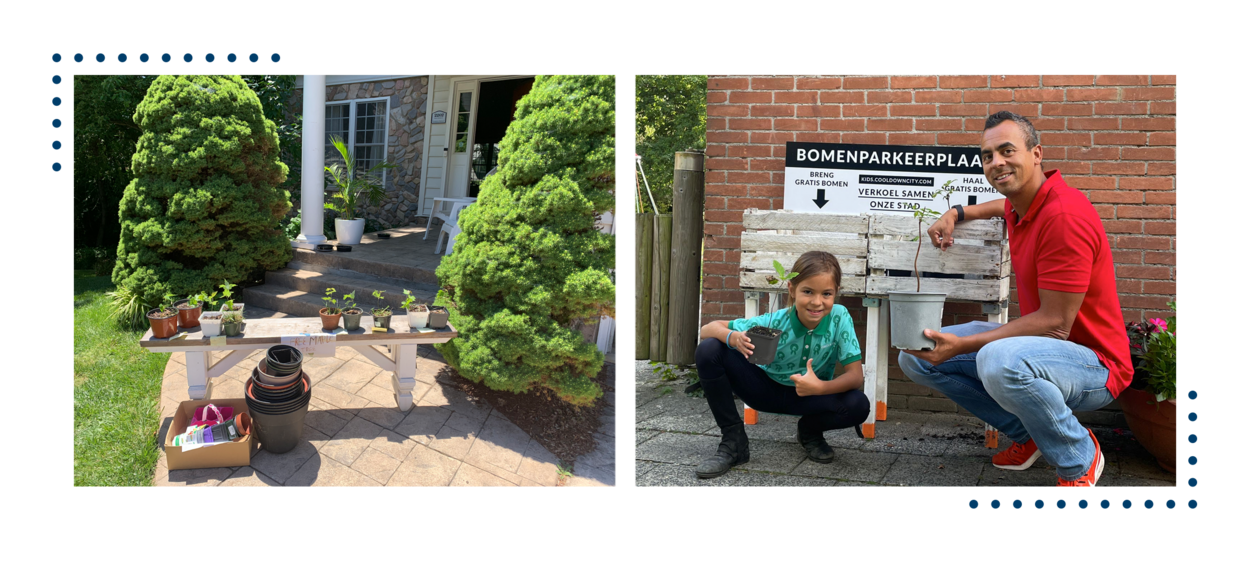 Ronalds bomenafhaalplek met stekjes van de Esdoorn voor zijn huis in Amerika. ‘Klanten’ brachten vaak spontaan lege plantenpotten mee. Terug in Nederland, samen met dochter Elle bij een Cool Down City-locatie in de Leidse speeltuin.