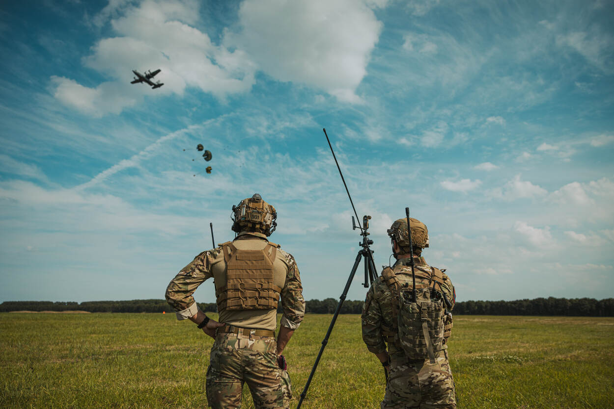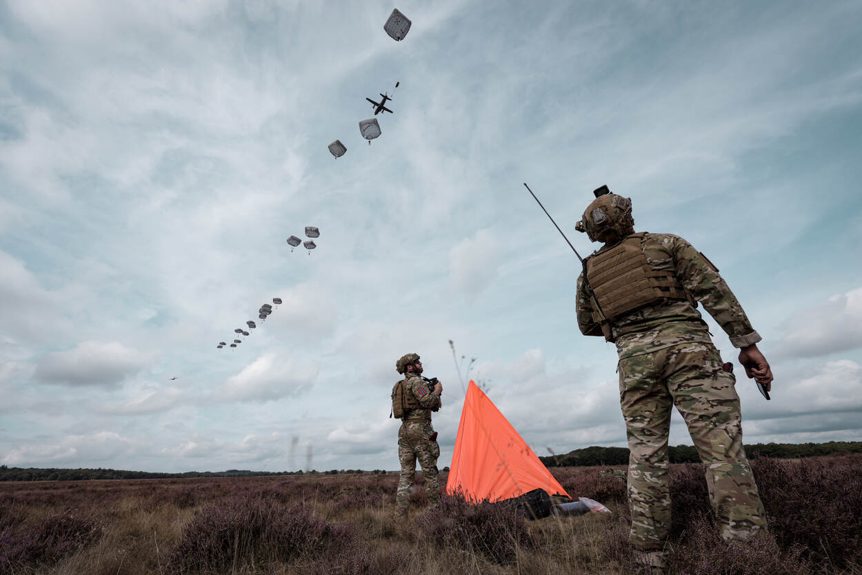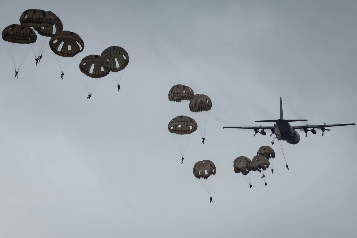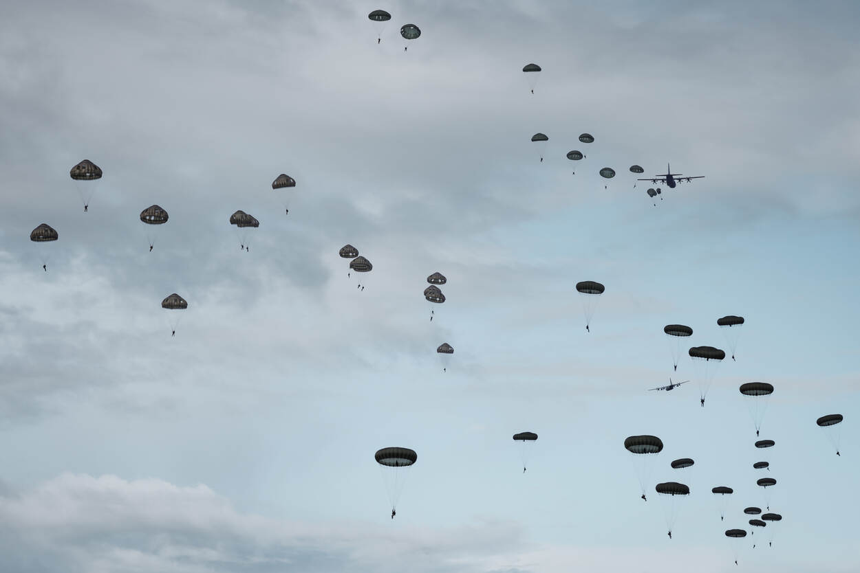 Zo’n duizend militairen uit dertien landen namen deze maand deel aan de internationale oefening Falcon Leap. Vanaf Vliegbasis Eindhoven vlogen bijna twee weken lang Nederlandse C-130’s en vliegtuigen en helikopters van internationale partners naar oefengebieden boven Nederland en België. Daar dropten ze de eerste week ladingen en in de tweede week parachutisten.