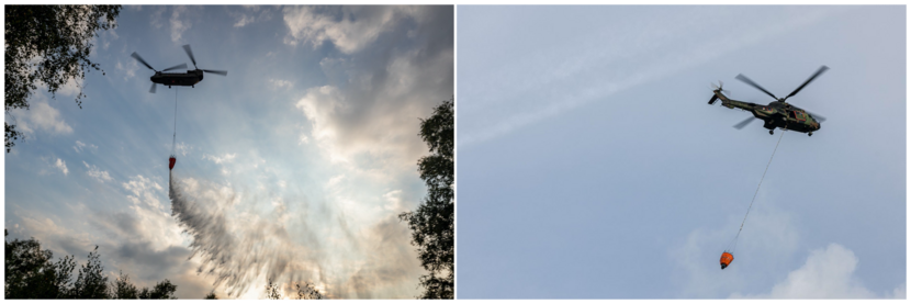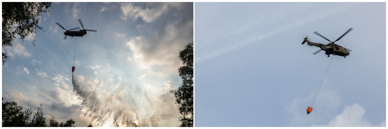 De helikopters van respectievelijk 300 en 298 Squadron vlogen gezamenlijk maar liefst 156 keer af en aan om water te droppen. De Bambi Buckets werden gevuld met water uit een plas bij het nabijgelegen Liessel. Foto: sergeant 1 Mike de Graaf