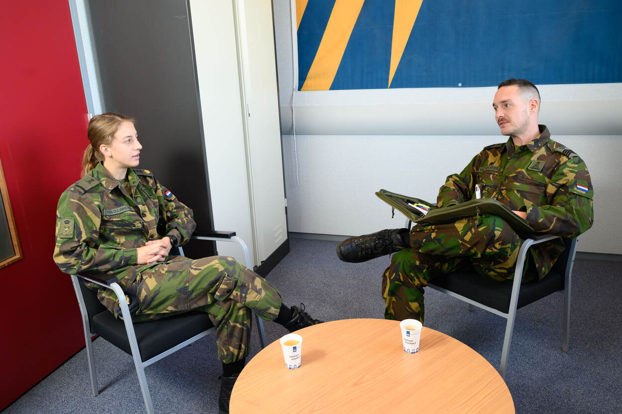 Tijdens feedback-gesprekken helpt de instructeur de cadet verder op weg.