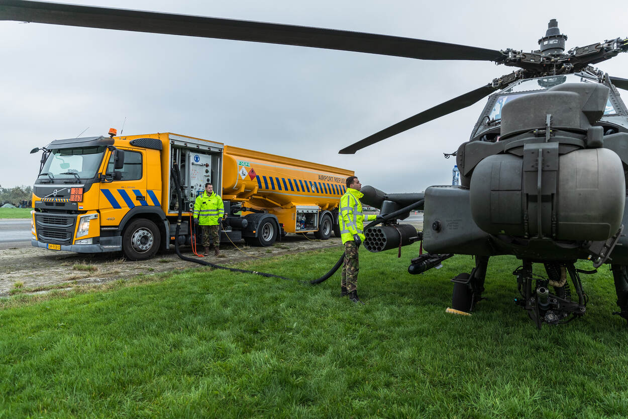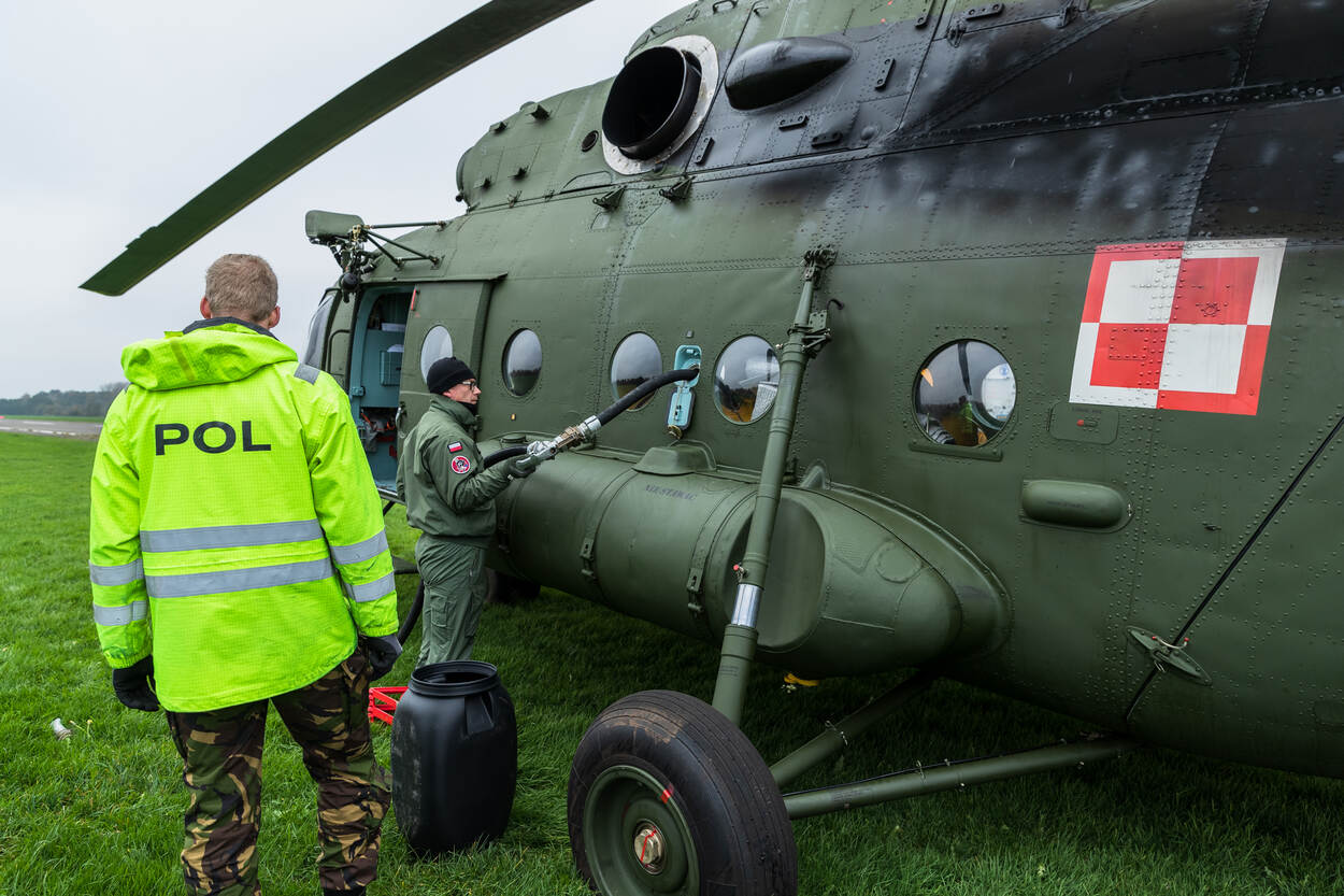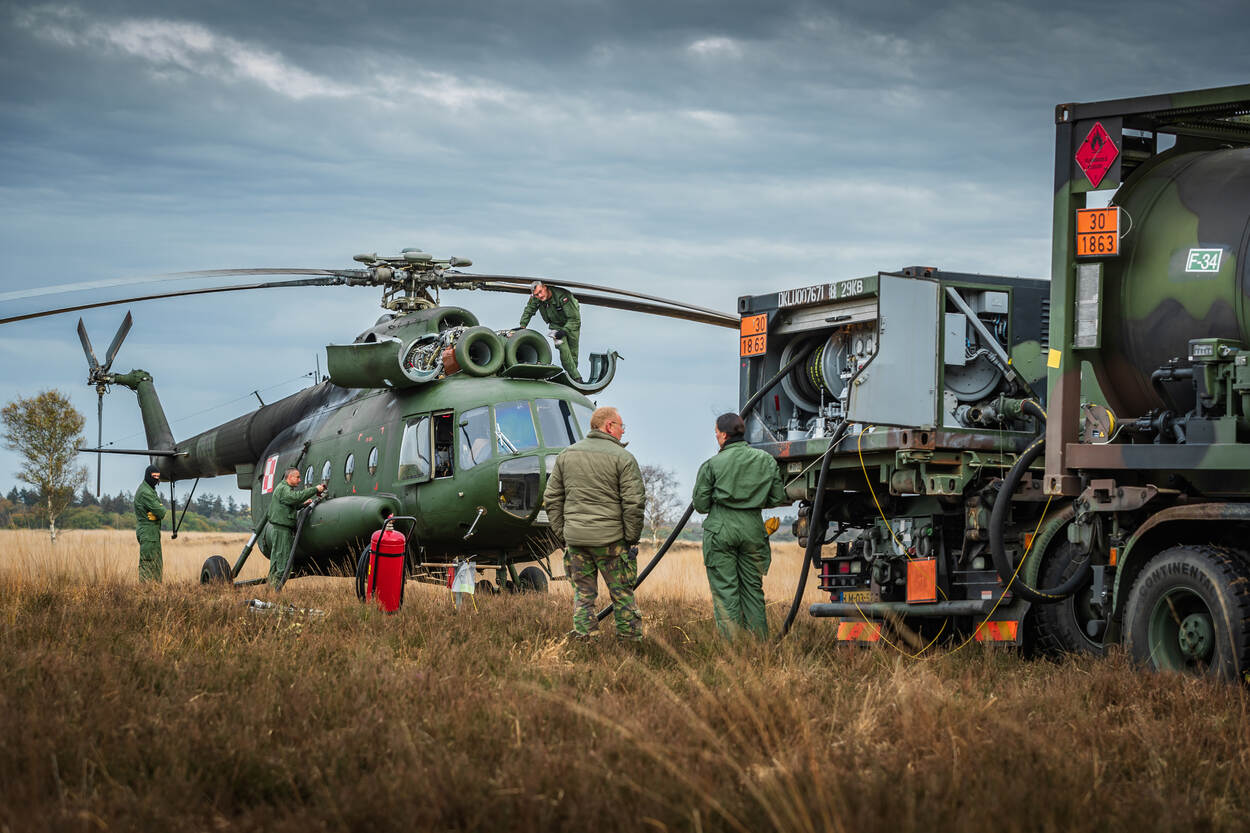 Bij het tanken, in dit geval van een Poolse Mi-8 Hip komt nog heel wat mankracht kijken. Ook daarin voorziet de luchtmacht.