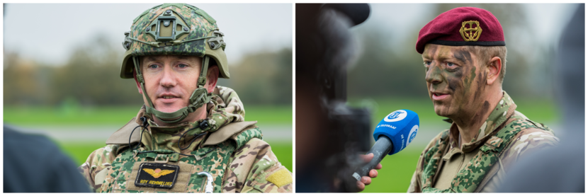 Hemmelder (l.) en Van Leussen van de luchtmobiele brigade tijdens het persmoment op Vliegveld Drachten.