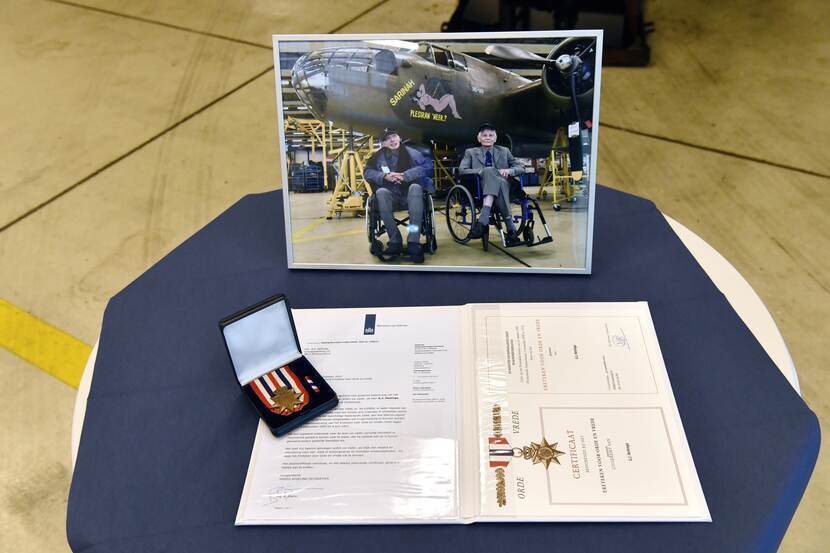 Nog wat verbouwereerd staat Beer Heitinga bij de B-25 Mitchell van de Koninklijke Luchtmacht Historische Vlucht (KLuHV) op Vliegbasis Gilze-Rijen. Zijn ogen dwalen voortdurend naar de palm van zijn rechterhand. Daarop ligt het Ereteken Orde en Vrede, voor zijn overleden vader Joop. “Ik heb er geen woorden voor, ben compleet beduusd. Deze medaille krijgt een speciale plek in ons ouderlijk huis”, zegt Heitinga zachtjes.