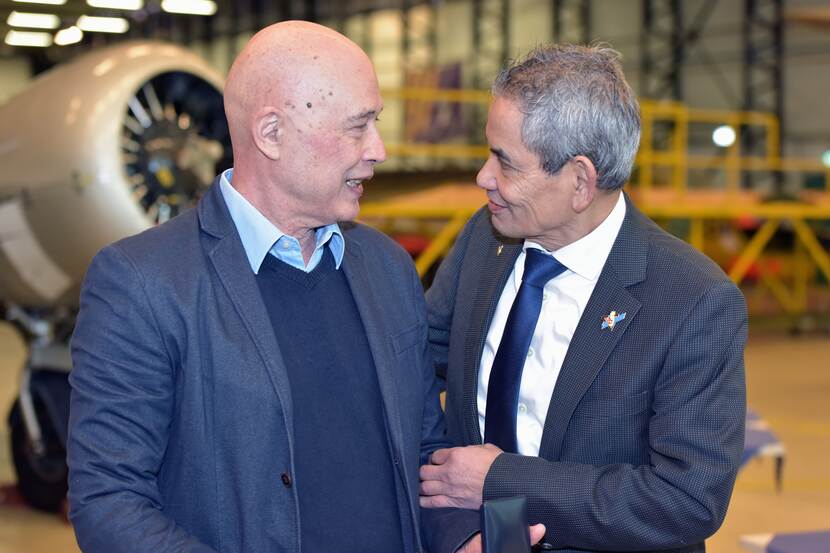 Een generatie later staan Beer Heitinga (72) en Franky Benthem (70) gearmd op de Vliegbasis Gilze-Rijen. Hun vaders waren goed bevriend. Je stelt je voor dat ook de dan nog jonge Joop en zijn sobat (vriend) Jan Benthem tussen 1947 en 1949 ooit zo hebben gestaan, broederlijk bij elkaar ver weg van huis en haard. Beer: “Franky heeft uitgezocht dat onze vaders recht hadden op het Ereteken Orde en Vrede. En dan is het helemaal mooi dat het hier kan. Wat een geweldige plek, zo vlakbij een type toestel waarin zij misschien ooit wel samen hebben gevlogen.”