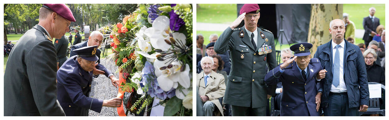 Baal met zijn zoon en commandant van Bronbeek kolonel Karel van Dreumel bij de jaarlijkse herdenking van de slachtoffers van de hell ships.