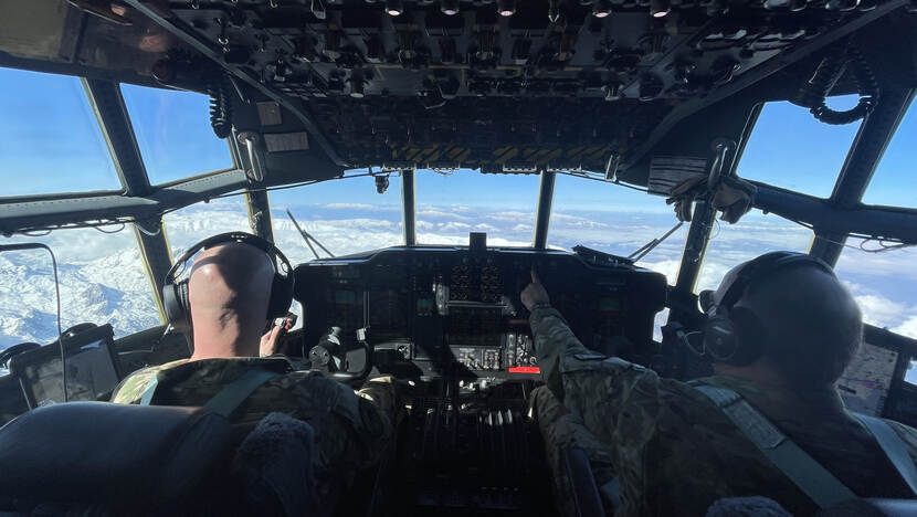 Foto vanaf de positie waar Jan normaliter als flight engineer zit. Het Hercules-detachement keerde op 25 februari tevreden terug op Vliegbasis Eindhoven.
