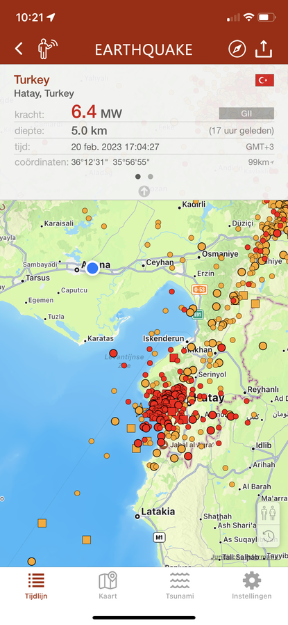 Blik op het alleszeggende lijstje met aardbevingen in februari in Turkije. In de blauwe stip Incirlik.