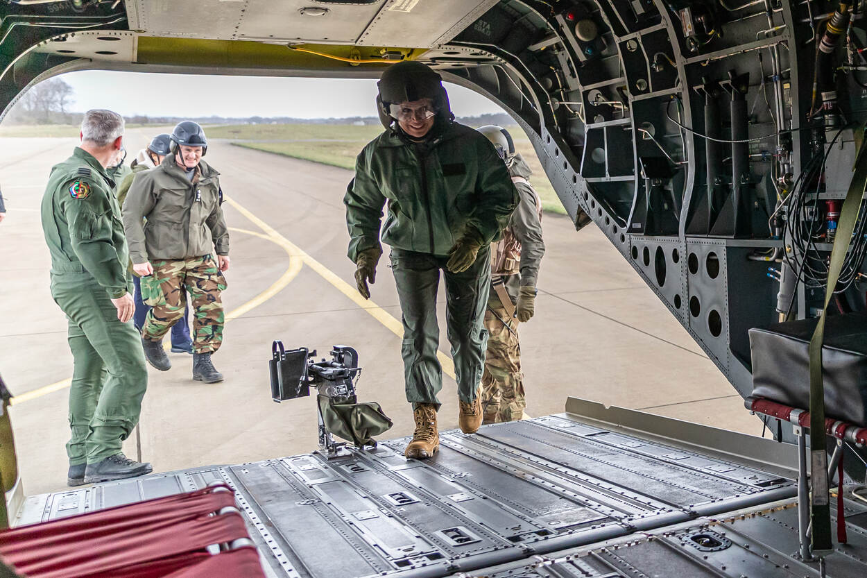 Na een introductie over helikopterontwikkelingen en -operaties bij het CLSK kreeg Máxima een briefing over FBO’s. Daarna vloog ze mee met een trainingsvlucht van een Chinook van 298 Squadron. Daarbij werd een Bambi Bucket gevuld en daarna een fictief gebied geblust. Na de vlucht sprak de koningin met personeel over de technische en logistieke ondersteuning bij FBO’s en de ontwikkeling van het DHC. Foto: sergeant-majoor Cristian Schrik