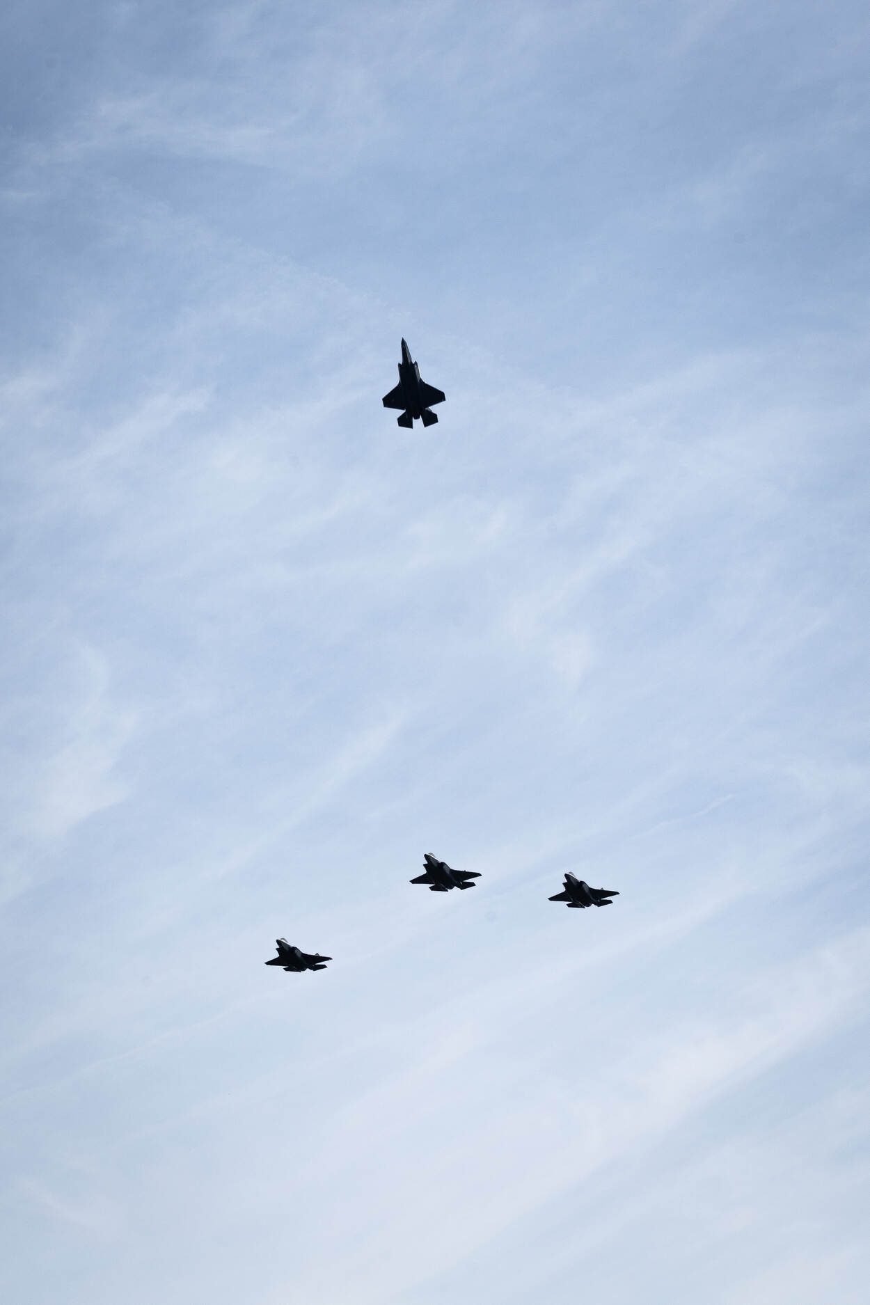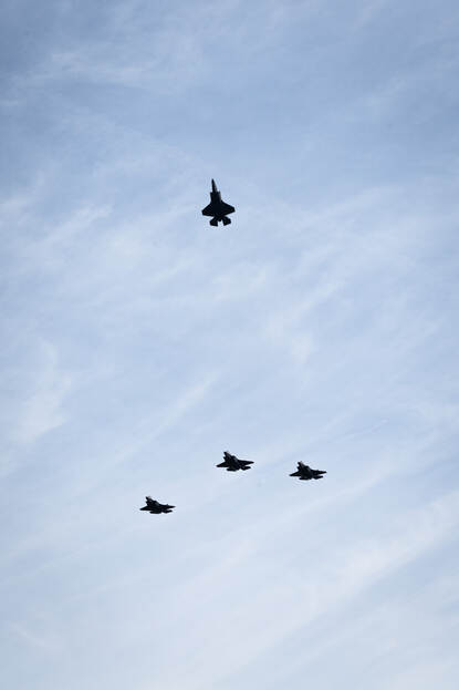 Eerder op de dag werden op de voormalige Vliegbasis Soesterberg traditioneel de gevallenen van de luchtmacht herdacht. Commandant Luchtstrijdkrachten luitenant-generaal André Steur legde hier een krans, samen met Luchtmachtadjudant Terry Venhovens. Na afsluiting zorgden vier F-35’s van Vliegbasis Volkel voor de missing man-formatie (foto rechts). Foto: korporaal Gregori Fréni