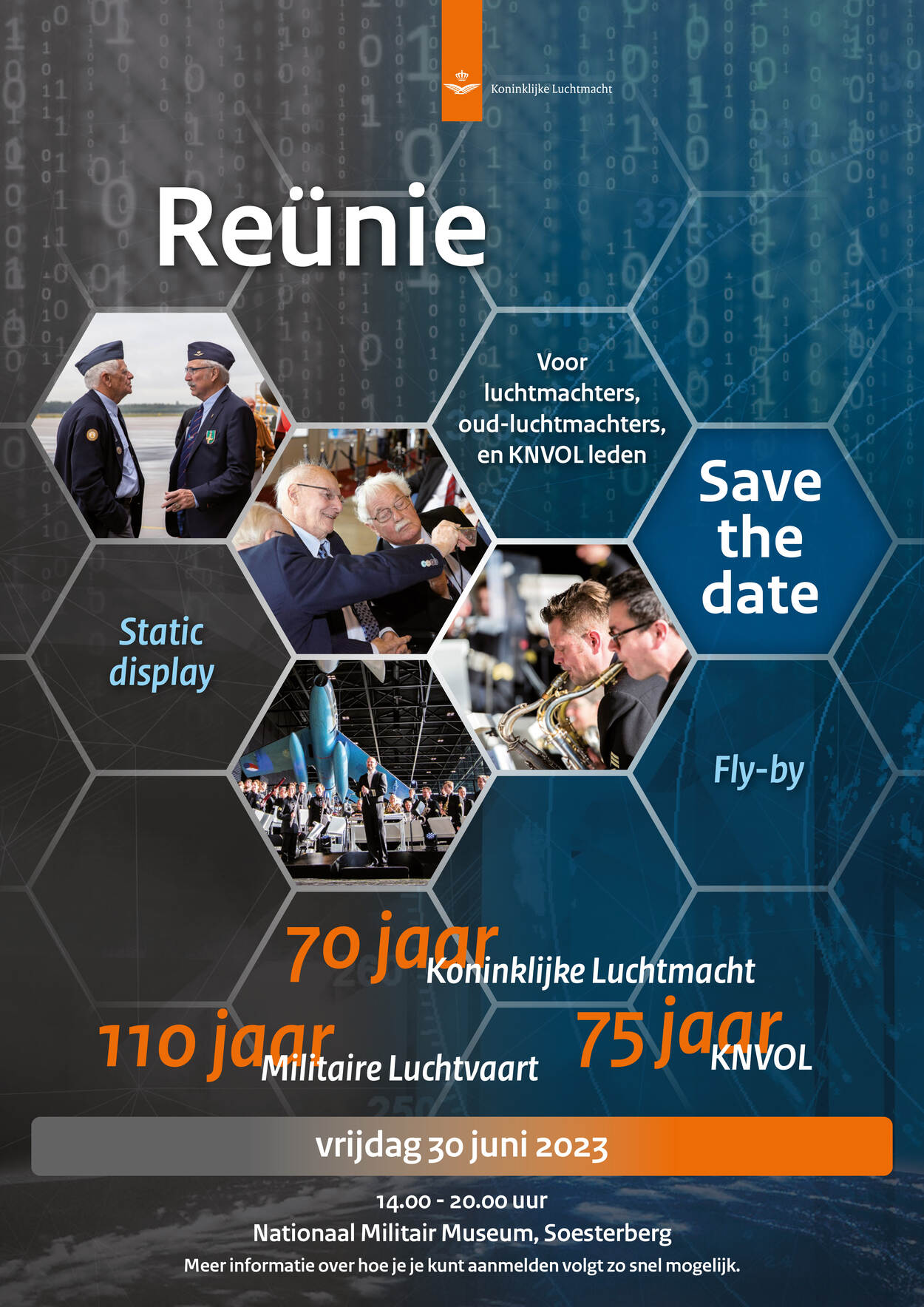 De reünie vindt plaats bij het Nationaal Militair Museum (NMM) in Soesterberg. Vanwege het 110-jarig bestaan van de militaire luchtvaart, 70-jarig bestaan van de Koninklijke Luchtmacht en 75-jarig bestaan van de KNVOL is het een extra feestelijk jaar. De reünie wordt omlijst met ontmoetingen, muziek van het Orkest Koninklijke Luchtmacht, een static show en een fly-by.
