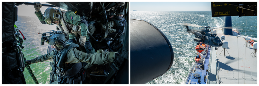 Na lang onderhandelen met de terroristen, maar zonder effect, grijpen de mariniers op de ferry in, zowel via de lucht als over het water. Enkele kapers proberen nog te ontsnappen met een snelle boot, maar een boordschutter van een helikopter weet dat te voorkomen. Op de foto’s personeel en Cougars van 300 Squadron in actie. Foto’s: sergeant-majoor Cristian Schrik