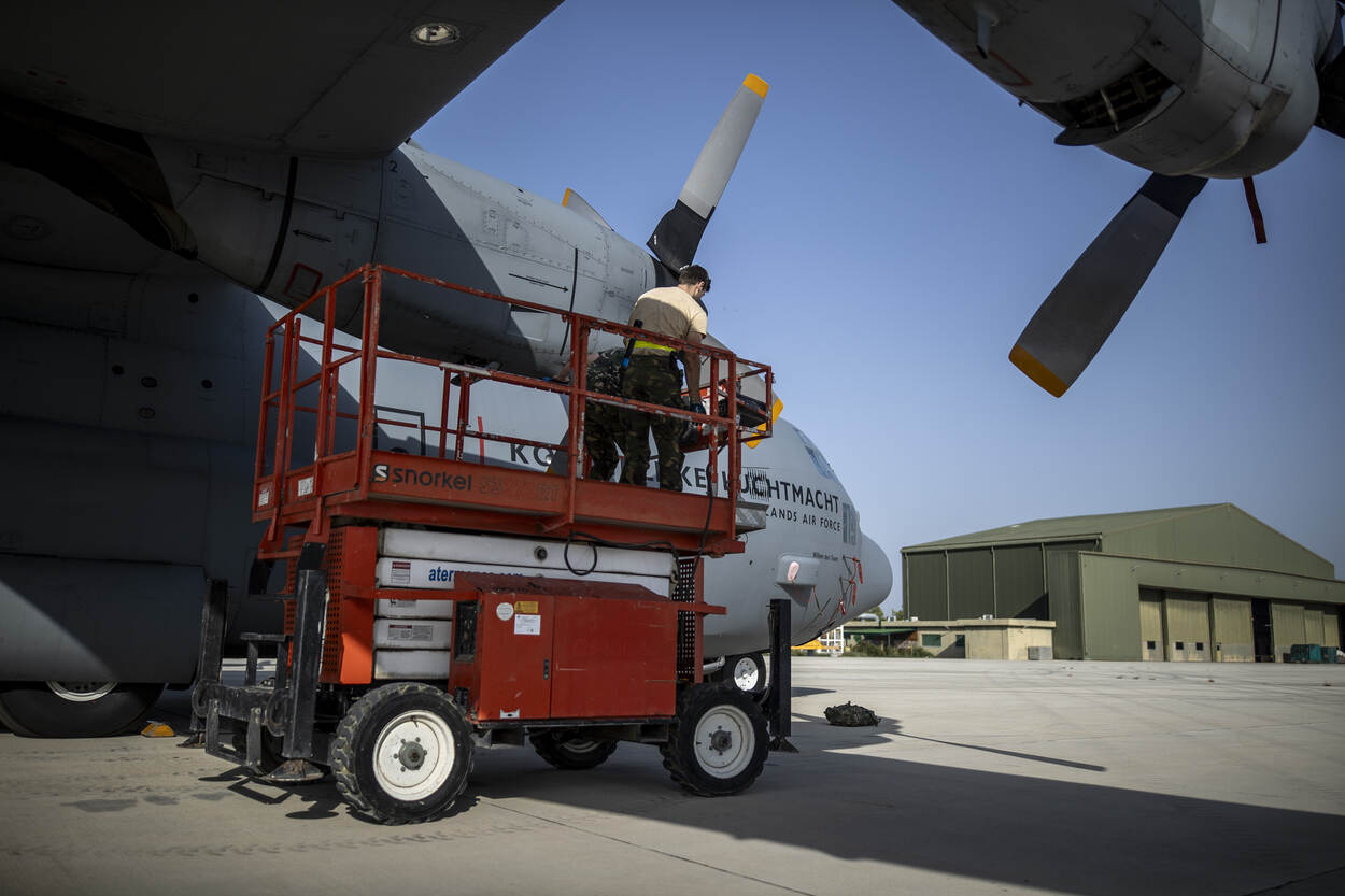 Het motortje van de ‘Snorkel’ slaat aarzelend aan op het militaire deel van vliegveld Paphos. Uiterst voorzichtig rijden twee monteurs de gehuurde – toepasselijk oranje – schaarlift onder een van de motoren van de C-130. In de schaduw, in de wind… de beste plek om op het heetst van de dag te staan. “En het is hier geen kippenhok”, roept een monteur lachend naar beneden. Hij doelt op de drukte in de hal die het Nederlandse detachement toegewezen heeft gekregen door host nation Cyprus. In die ruimte is inderdaad veel te doen, staan een hoop spullen, lopen verschillende eenheden kriskras door elkaar. Gecoördineerd, dat wel, maar als je van rust houdt sta je op de apron meer op je gemak.