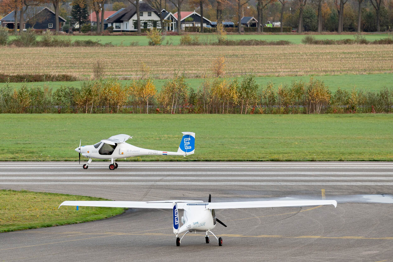 Zo’n twintig minuten later worden twee toestellen van het type Pipistrel Velis Electro de hangaar uitgerold. Onderdeel van de routine vóór vertrek is dat de motor enkele seconden op volle toeren draait. Dat blijkt een hele rustige check, want hierbij is alleen het ‘zuivere geluid’ van de harddraaiende propellers in de wind te horen.
