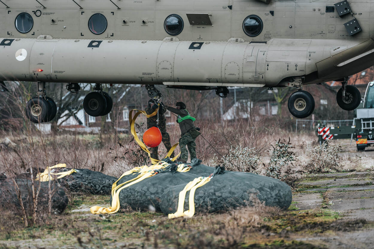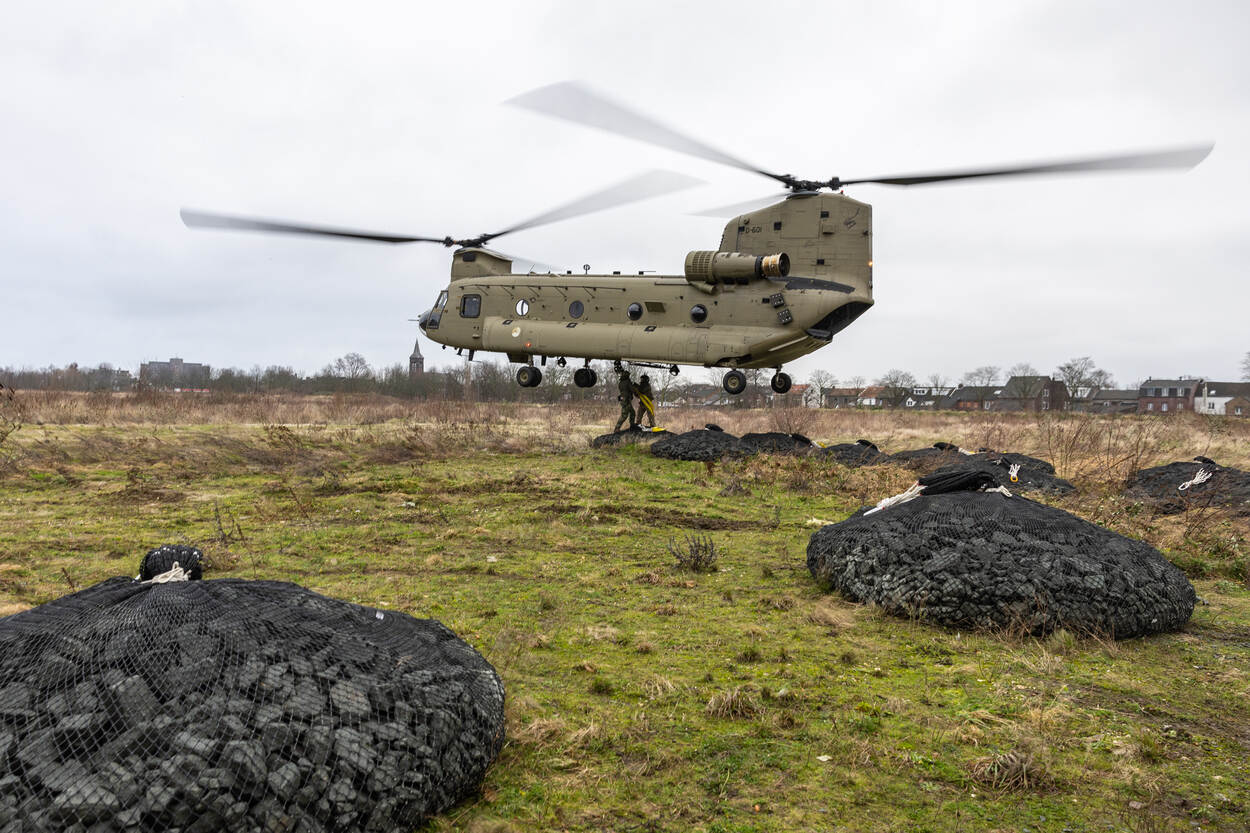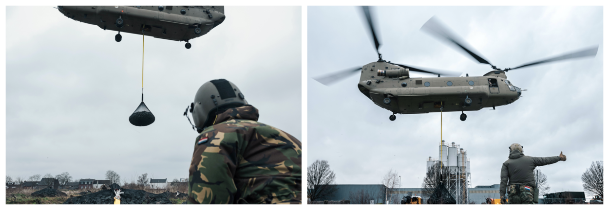 Het is zaterdagochtend rond een uur of 10 als de laagvliegende Chinooks hun opzienbarende entree maken. Op dat moment zijn 25 militairen van 105 Genietroepen Waterbouw al bijna een dag in touw om Rijkswaterstaat uit de brand te helpen. Ook de hulp van de luchtmacht komt als geroepen.