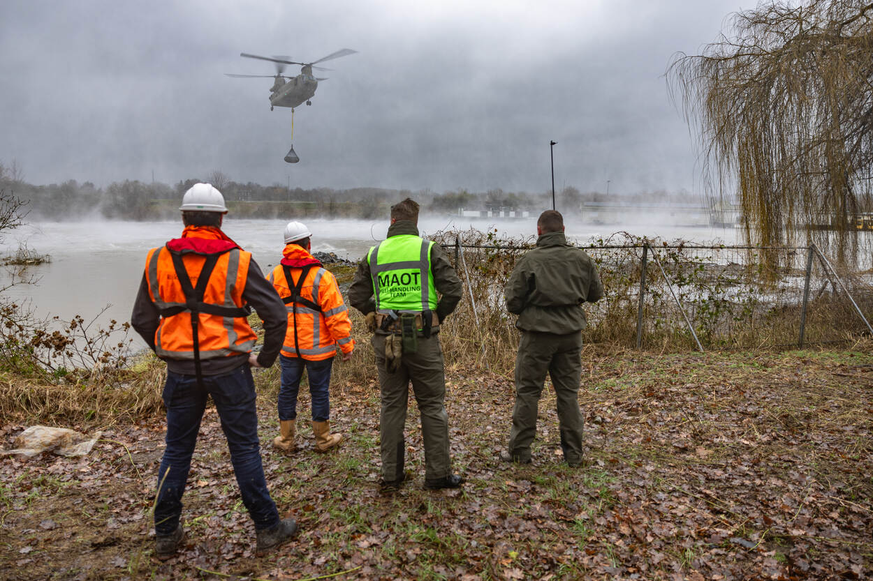 Bas en zijn MAOT-collega Joep turen verkleumd naar een Chinook die langzaam een net in de Maas-vertakking laat zakken. Door de downwash is een nat pak gegarandeerd: een hoosbui aan water stijgt op. Ter hoogte van de kapotte dam wijst iemand van Rijkswaterstaat naar rechts. “De Chinook moet iets verder die kant op”, vertaalt zijn collega. Het MAOT geeft dat via een radioverbinding door aan de vlieger, die op zijn beurt twee meter stroomopwaarts vliegt. Dan laat hij de lading los. “Perfect!”, roept de man van Rijkswaterstaat.