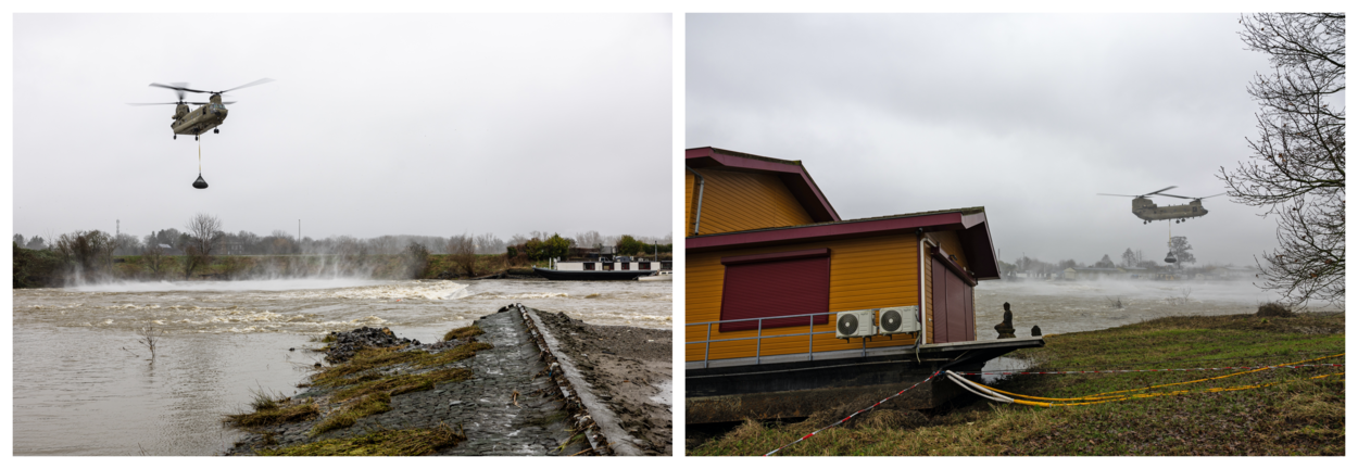 Het was een spectaculair gezicht, in het eerste weekend van januari 2024 in Maastricht. Door grote netten vol stenen in een vertakking van de Maas te droppen, herstelden twee Chinooks van het Defensie Helikopter Commando een dam. Die was door snelstromend water doorgebroken. “Deze hulp was uniek en broodnodig”, zegt projectleider Dirk Jan Kiljan van Rijkswaterstaat. “Niemand anders kon ons beter helpen dan de luchtmacht. We zijn hier heel blij mee.” Een terugblik op een enerverend weekend.