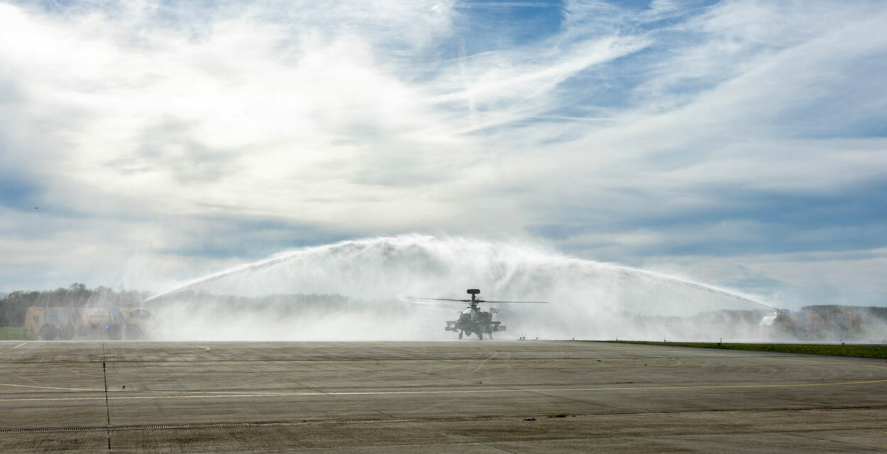 Twee brandweerwagens spuiten een waterboog waaronder de Apache door taxiet.