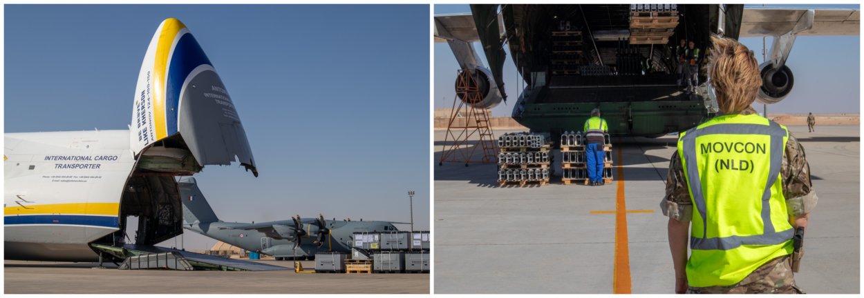 Het team is ingevlogen met een Antonov An-124, na de vernietiging van de enige Antonov An-225 het grootste transportvliegtuig ter wereld. Aan boord waren onderdelen van zo’n twaalf meter lang, die niet in een regulier transportvliegtuig passen. Foto’s: Defensie