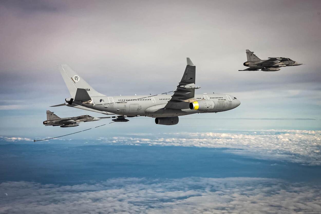 Tsjechië is één van de zes partnerlanden binnen de MMU. Die vloot bestaat nu uit zeven A330 MRTT’s en daar komen er vooralsnog nog drie bij. De JAS 39 Gripen maakt om in de lucht te tanken gebruik van het hose and drogue-systeem. De luchtmacht van het land beschikt over twaalf van deze jachtvliegtuigen, die het leaset van Zweden. Foto: Tsjechische luchtmacht.